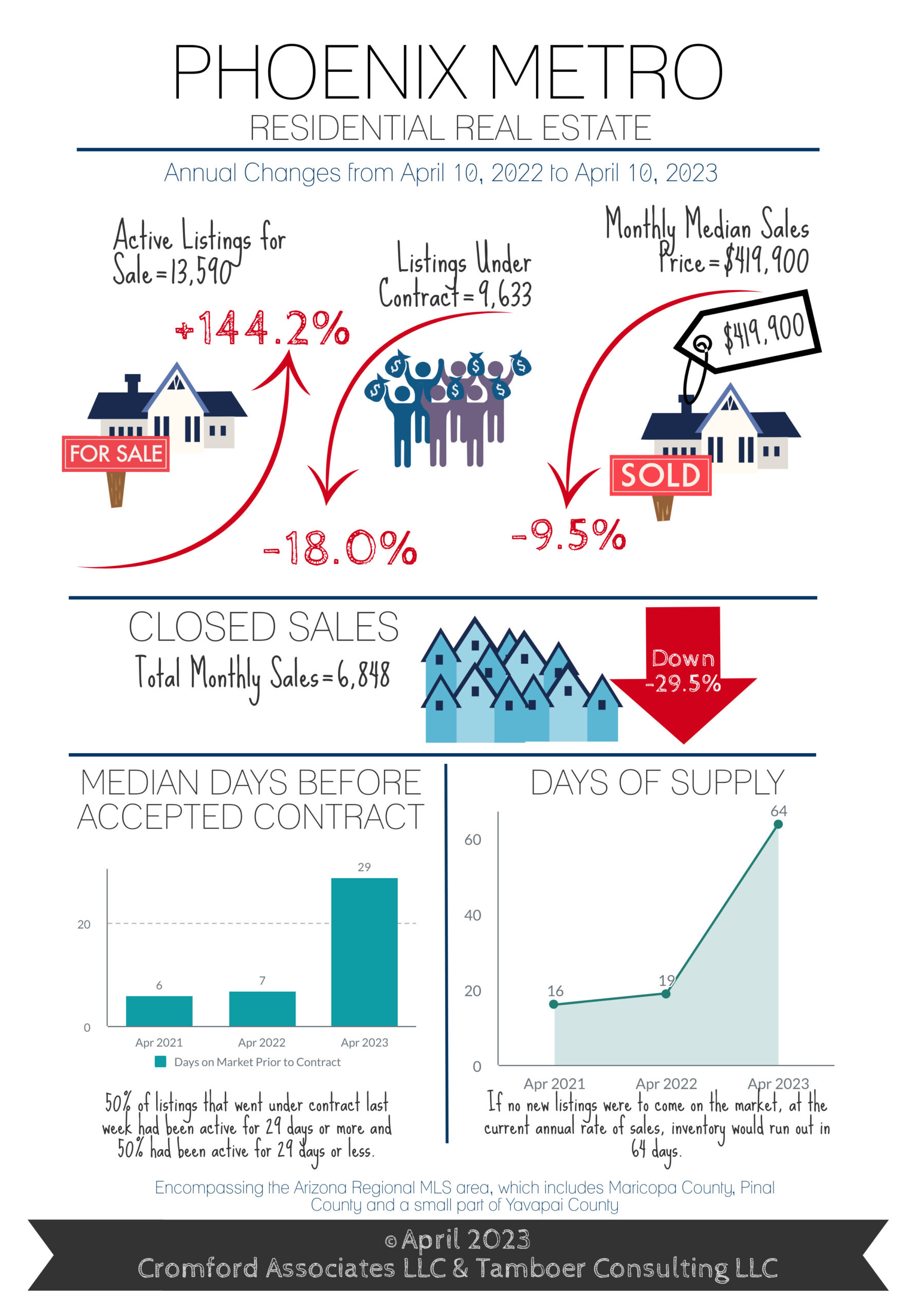 It’s been an eventful 4 weeks, again. Conventional rates dropped from their high of 7.1% on March 2nd to 6.1% by April 5th. Buyers entering the market in Phoenix today may be getting an unexpected shock if they’re looking for desperate sellers and rock bottom prices. Two more cities entered seller’s markets this month, Surprise and Goodyear. Now 14 out of the 17 biggest cities are favoring sellers and some zip codes in Chandler and the West Valley are on the market just 2-3 weeks prior to contract, down from 9-11 weeks.