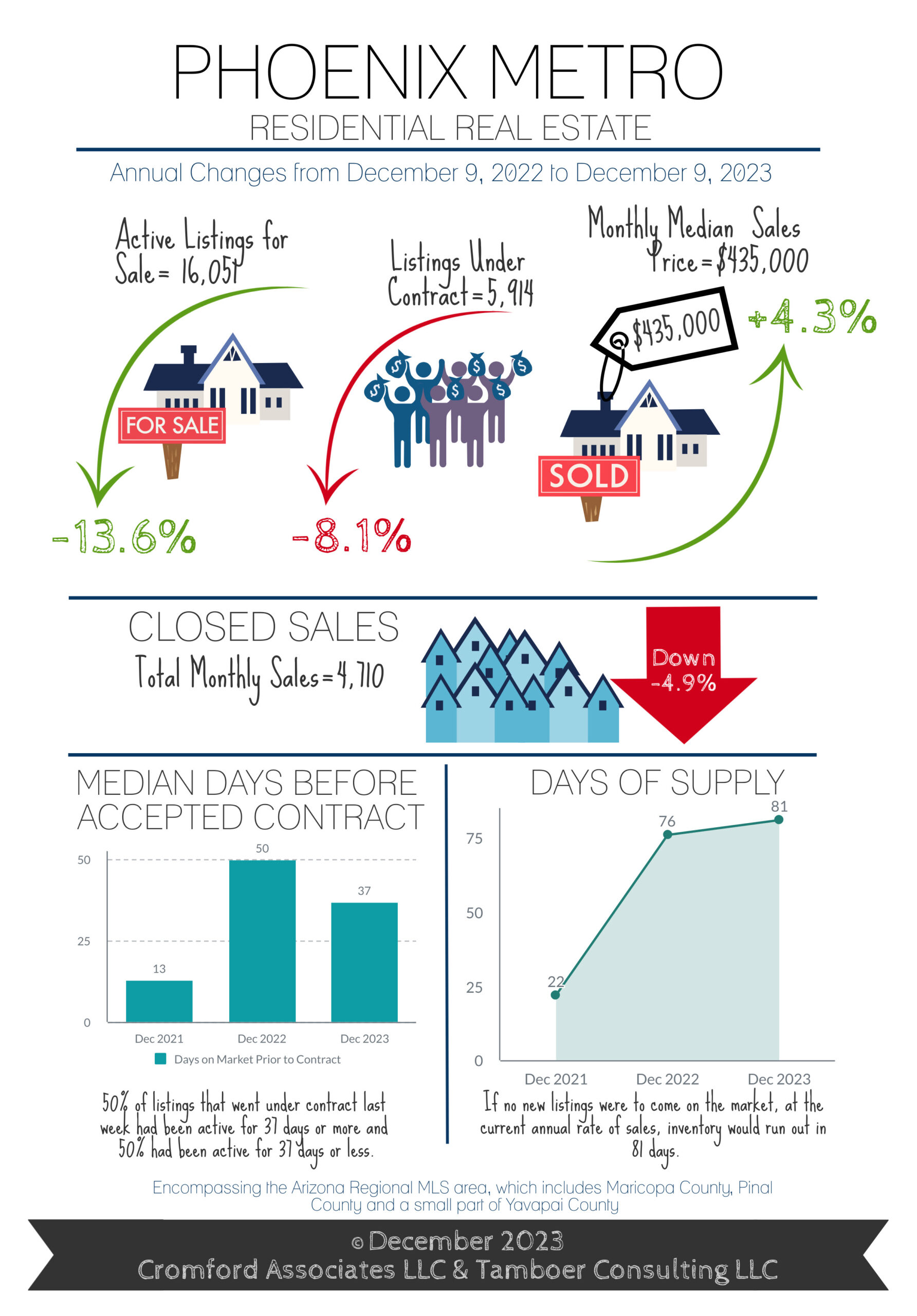 Greater Phoenix has moved out of a seller’s market and into a balanced market, but it’s unclear how long this opportunity will last for buyers. December is typically the calm before the storm each year for the housing market, and this year is no different. New listings are at their lowest this month as many sellers opt to wait until January to list their home. As a result, supply can become stale and picked over. However, the lull is a window of opportunity for negotiations as the remaining sellers want to be under contract before the wave of new listings come in the new year. There is uncertainty mixed with hope in the market today as mortgage rates have declined from 8.0% to 7.0% since October. Every day the mortgage rate declines, more buyers are able to purchase. Last year, also from October to December, rates dropped from 7.4% to 6.1%. This was enough to pull the housing market out of a buyer’s market, into balance, and eventually a seller’s market once again by January. This put upward pressure on price until May, when rates rose once again to 7%. If rates continue their decline and drop below 6.5%, we expect to see noticeable improvements in buyer demand as we enter 2024.