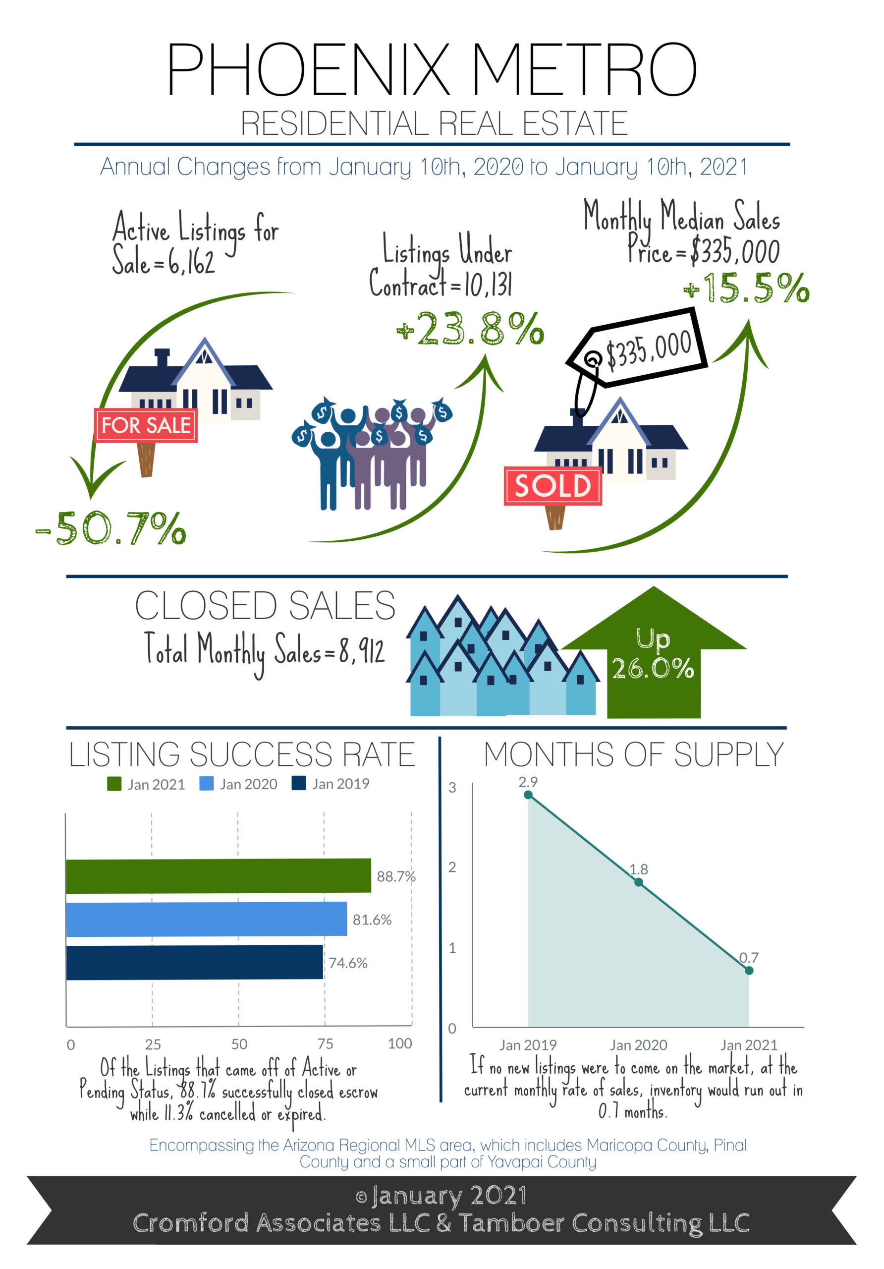 There were 111,036 new listings added to the Arizona Regional MLS (ARMLS) in 2020, only 38 more than 2019, while 100,650 sold. As of January 10th, 2021 there were only 6,162 listings still active in the MLS, which is the lowest supply count recorded in at least 20 years. To make matters worse, 10% of those proper- ties are outside of the Greater Phoenix boundary.