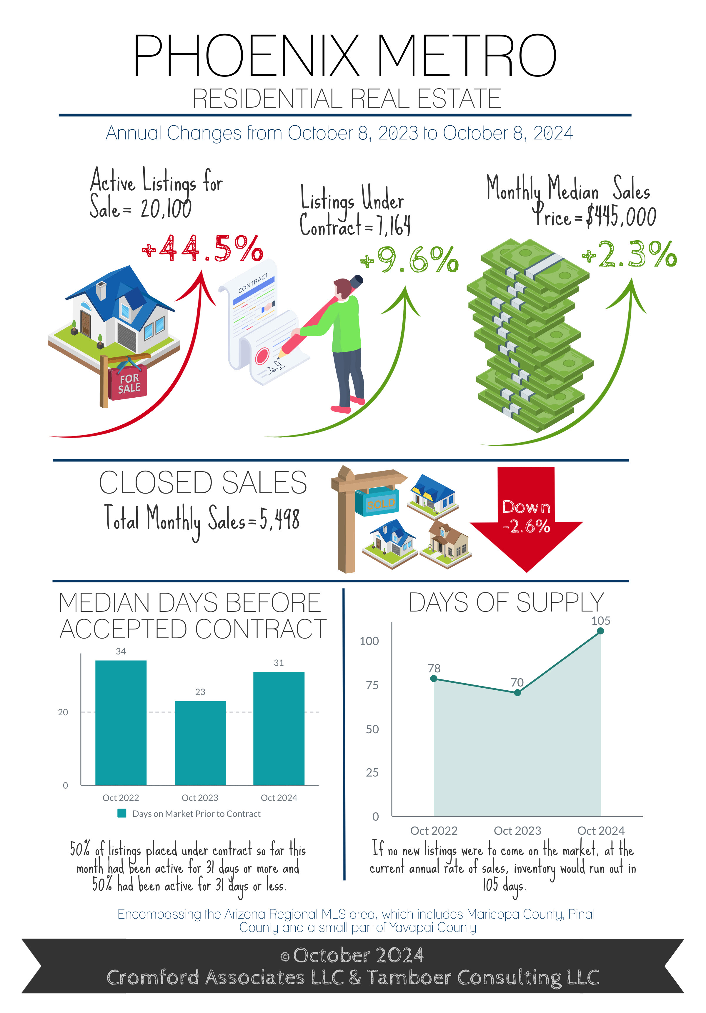 Seasonally, this is the best time to be a buyer in Greater Phoenix. It’s typical to see active listings rise as weekly accepted contracts decline, giving existing buyers lots of homes to choose from and fewer competitors. Seasonally adjusted measures, like the Cromford Market Index are showing a market in balance, indicating very little fluctuation in price measures in either direction. In this environment, every drop in the mortgage rate means all properties go on sale. Greater Phoenix has only seen a market this favorable for buyers twice in the last decade, and both times the opportunity was fleeting; lasting only 9 weeks in 2022 and 5 weeks in 2014.