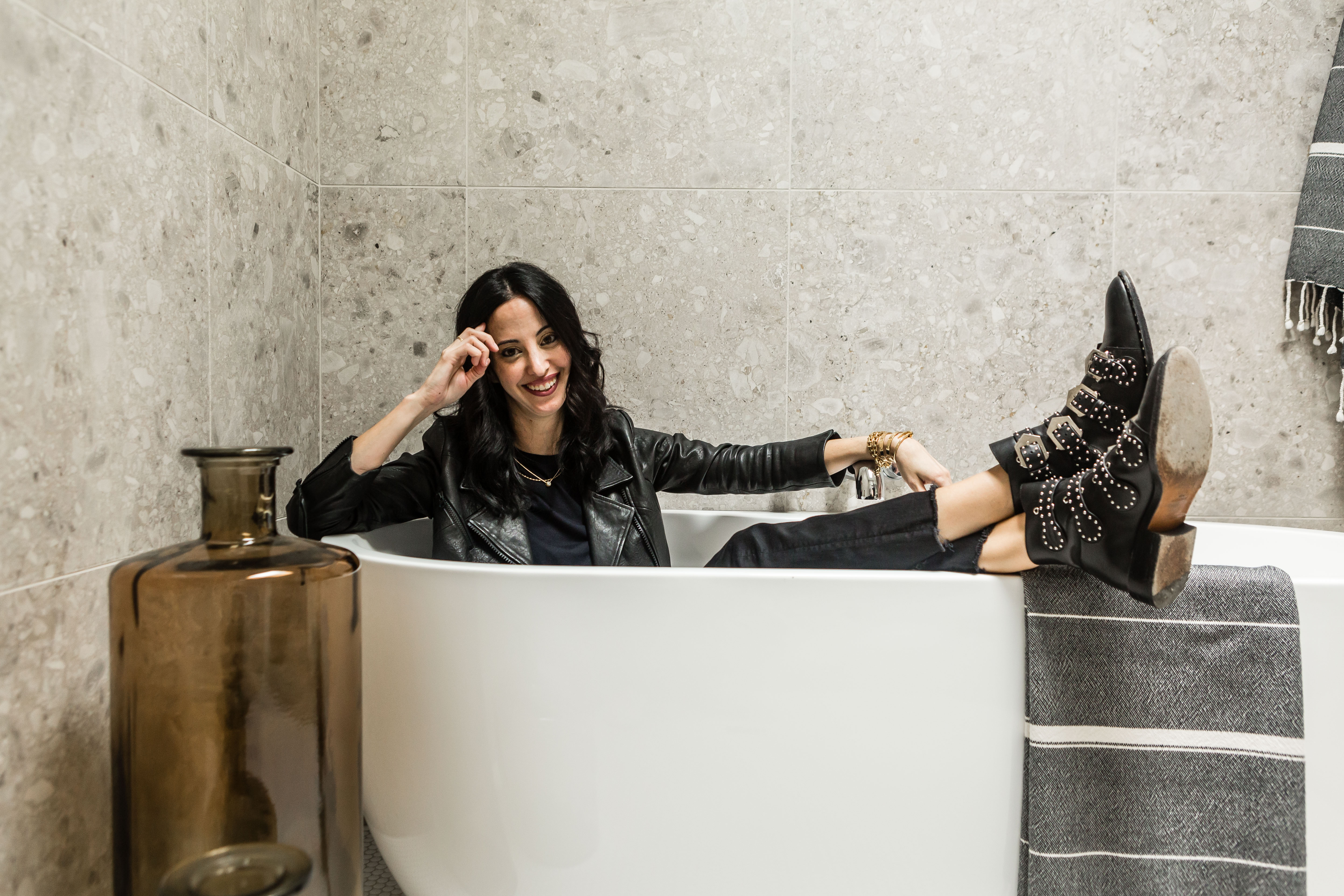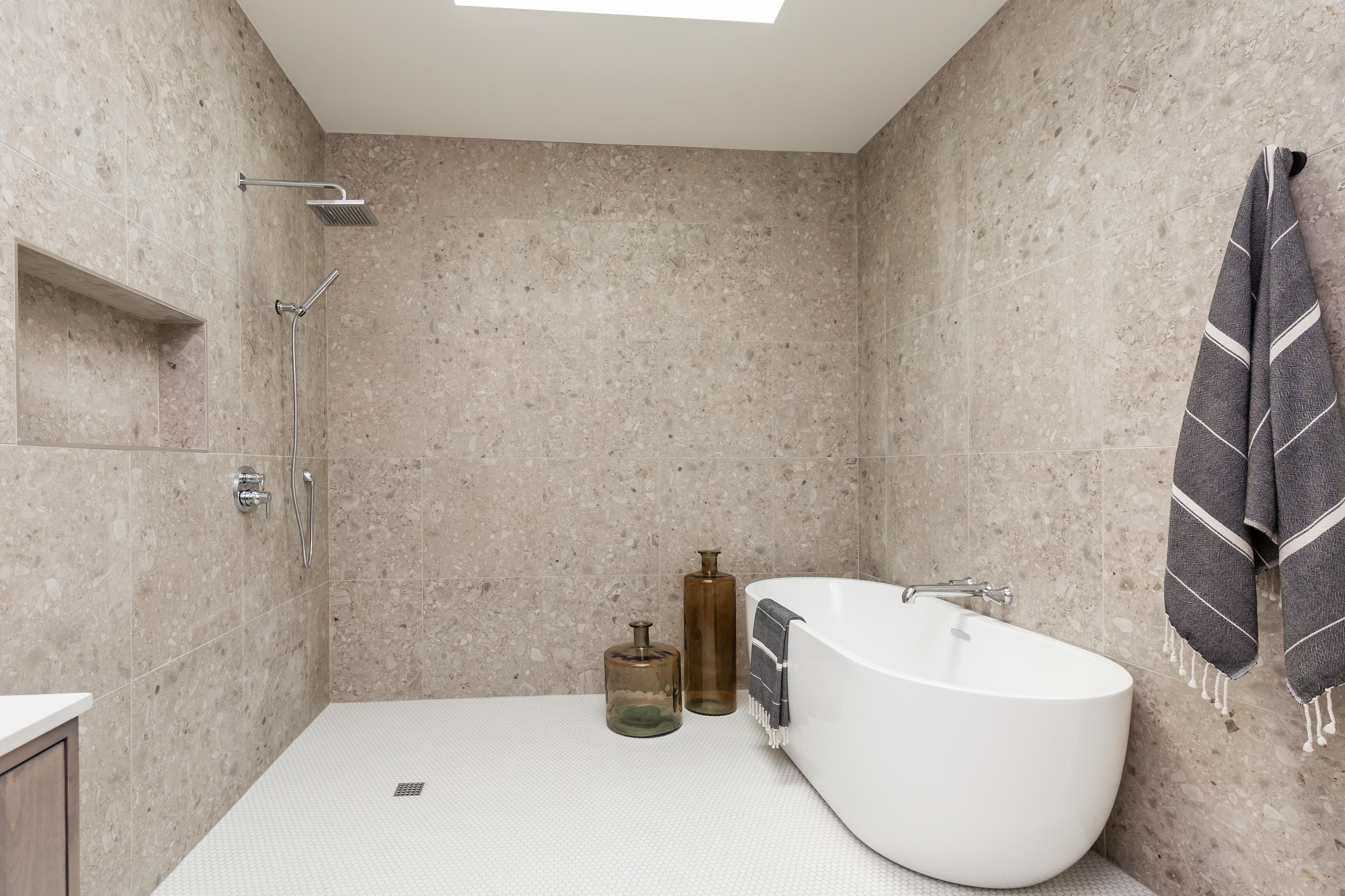 Jenn: The master bath was a big commitment, but it turned out amazing. The terrazzo-look tile used on the walls is another nod to the past but done in a way that brings in an organic/desert vibe. Another opportunity to bring in natural light with the skylight- which was key here- makes the European style shower feel like a personal spa.