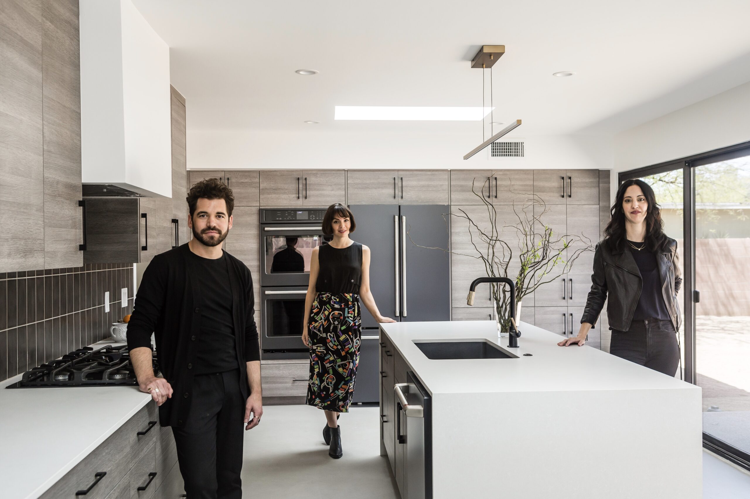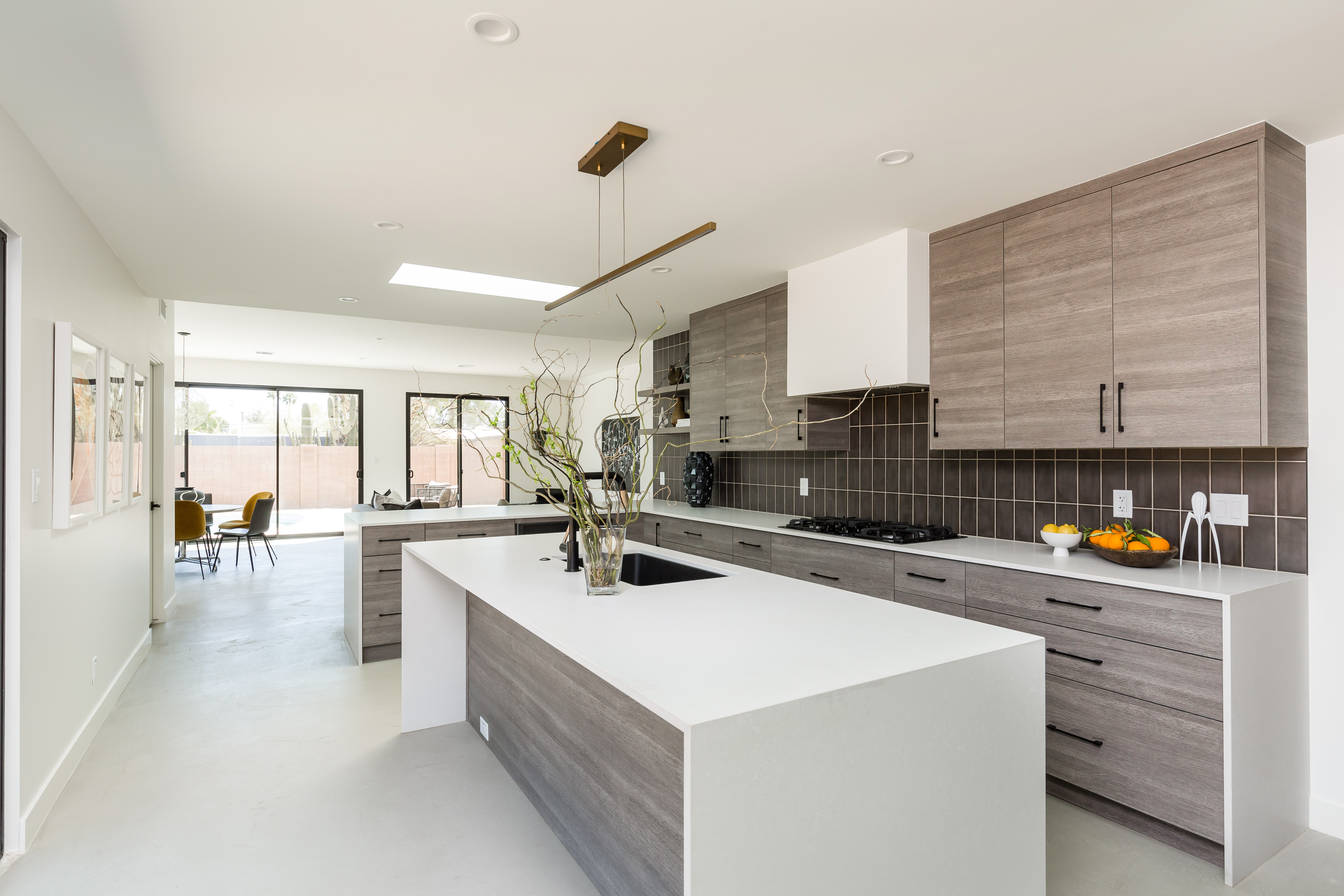 Jake: The kitchen. Originally the dining+kitchen area, the expanded kitchen transitioned the mid-century “shell” into the added open gathering space. It ended up halfway between the past and the present with clean lines and a soothing palette while interest was added with brushed wood grain textured cabinets, simple bronze and black details, and creamy honed quartz. I love how the sunlight floods the space from two skylights, placed flanking the central island. The counter space here is extensive, and the storage plentiful, this is the heart of the home and ready for a functional and fruitful future.